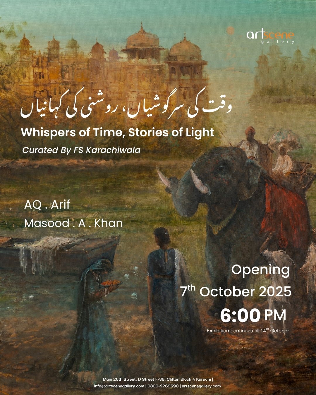 Together, the two artists create a rhythm of contrasts and continuities: Masood’s light rising out of shadow like a fragrance, and Arif’s landscapes of quiet resonance, grounded in history and contemplative stillness. Both cross the delicate terrain of memory, belonging and imagination, each in their own language yet harmonized in spirit. Whispers of Time, Stories of Light is not merely an exhibition, it is an encounter with the unseen. Listening the softvoices of light and time and arriving into a space where love, heritage and reflection touch into story and silence alike.